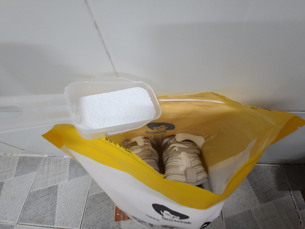 비닐봉지에 신발을 넣은 뒤 과탄산소다 한 스푼을 넣어 줍니다.