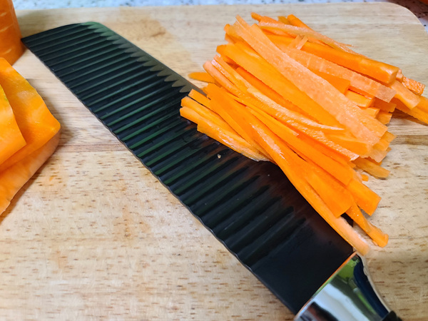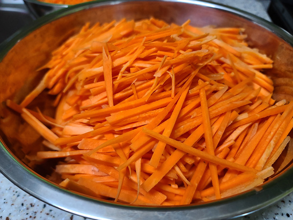 당근을 채썰때는 조금 두텁게 썰어도 됩니다. 그래야 요리시 물러짐이 없이 다른 채소와 잘 어우러져요.
