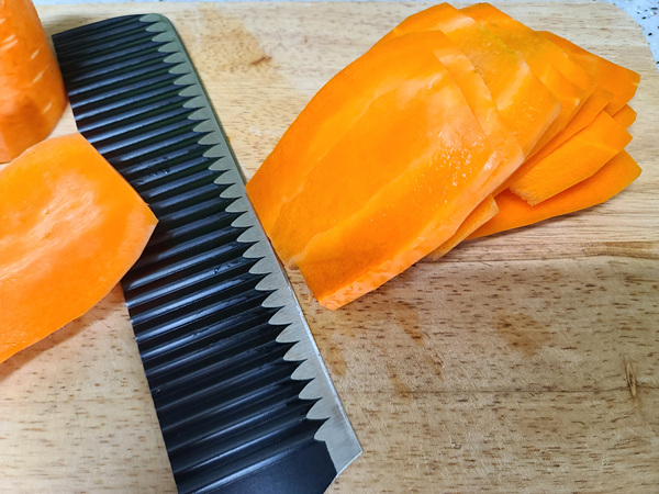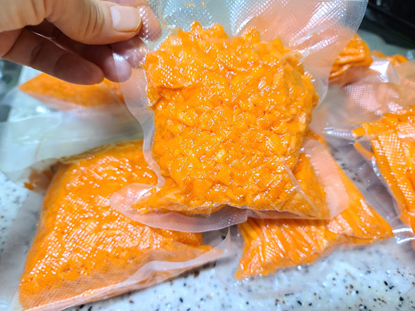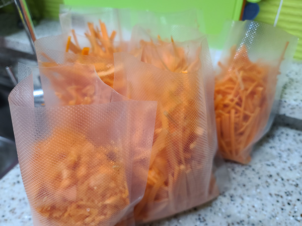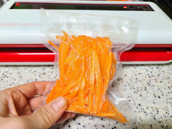 이렇게 썰어 놓은 당근은 공기가 들어가지 않게 밀봉해 두면 냉장고에 넣었을때 자리를 많이 차지 않아 좋아요. 만약 밀봉하는 기계가 없다면 비닐봉지에 넣어 공기를 최대한 빼고 묶어 주시면 되세요.