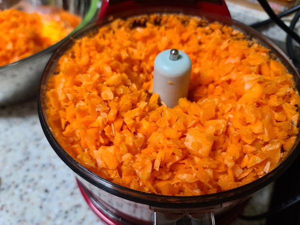 당근을 다질때는 전용기계를 이용하는 편인데요. 먼저 조금 작게 썰어 준 뒤 기계에 넣어 다져주면 됩니다. 이런거 집에 하나쯤 가지고 계실거라 생각해요. 만약 기계가 없다면 채썰어서 반대편으로 잘라주면 다짐이 되니 그렇게 힘들진 않을거에요.