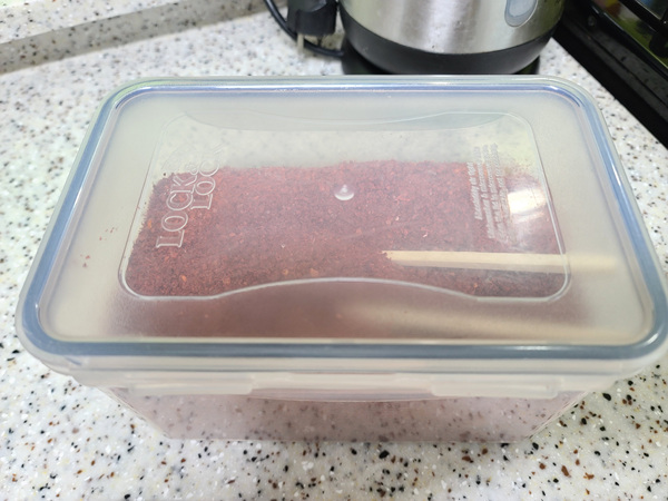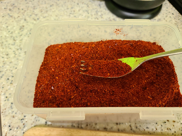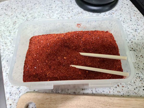 간단한 방법은 포크로 몇 번 고추가루를 들어 올려 뭉침이 있는건 풀어줘야 한다는 점.... 안 뭉쳐 있고 가루화가 잘 된 것은 포크에 고추가루가 잘 빠져 나가겠죠.