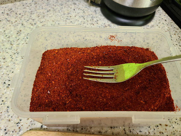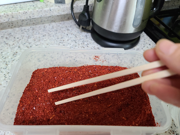 간단한 방법은 포크로 몇 번 고추가루를 들어 올려 뭉침이 있는건 풀어줘야 한다는 점.... 안 뭉쳐 있고 가루화가 잘 된 것은 포크에 고추가루가 잘 빠져 나가겠죠.