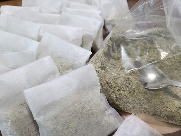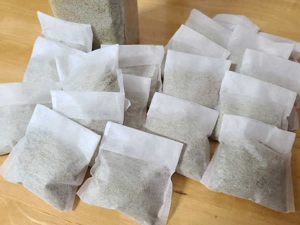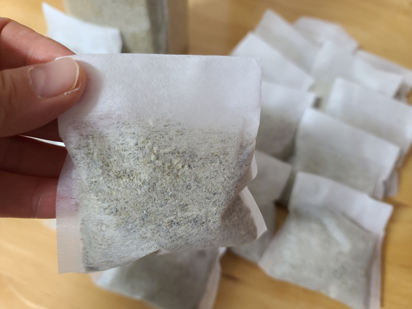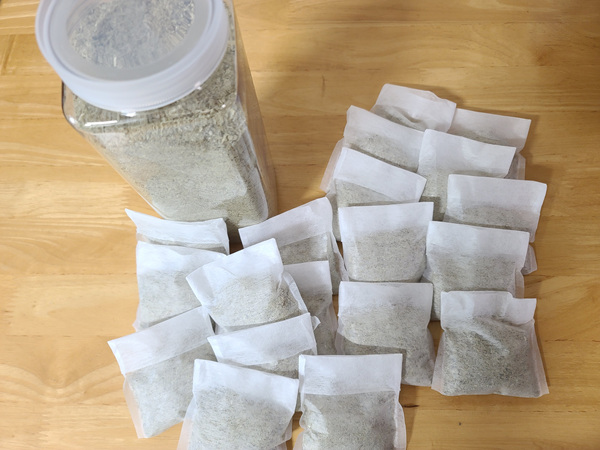 멸치가루를 냉동실에 꺼냈습니다. 그리고 집에 있던 1회용 다시백을 꺼내 적정량 담기로 했어요.