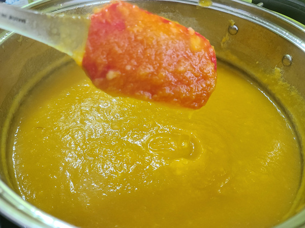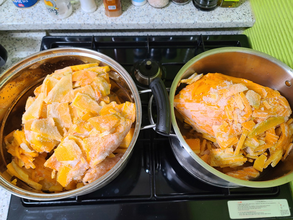 농도도 딱 좋고 설탕을 많이 넣어서 달달한 것이 아닌 늙은호박 본연의 단맛이 강해 정말 맛있었답니다. 그래서........ 냉동실에 남은 늙은호박을 다 꺼내 끓여 놓기로 했죠.