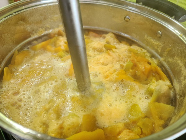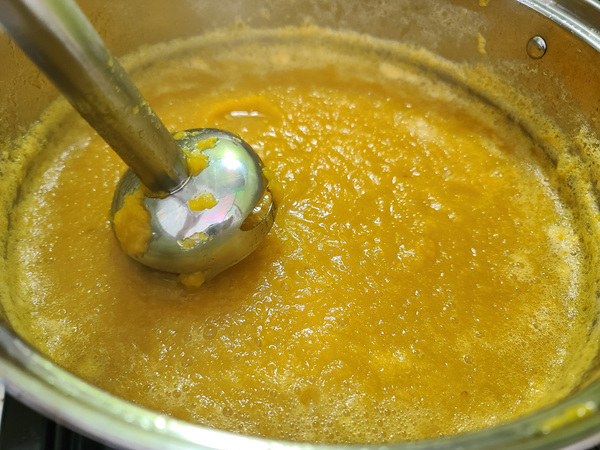 약 15분 정도 푹 삶으면 숟가락으로 들었을때 몽글몽글 부서지는 느낌이 있는데요. 그때 불을 끄고 핸드블랜더로 갈아 줍니다. 만약 핸드블랜더가 없다면 조금 식혀서 믹서기로 갈아 주셔도 됩니다.