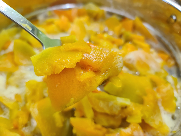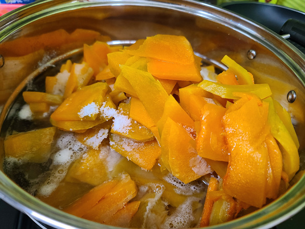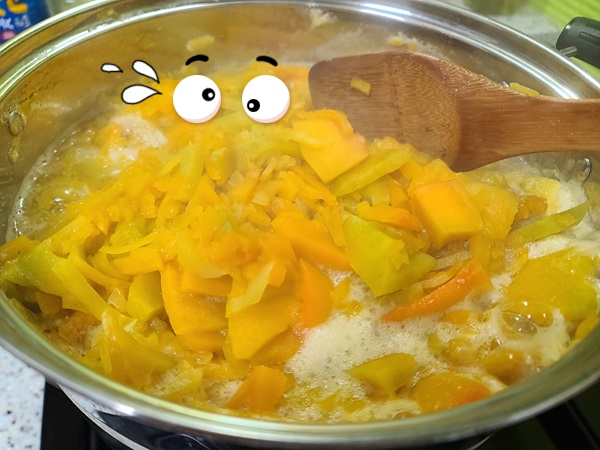 1.냄비에 호박과 설탕 그리고 물을 붓고 끓여 줍니다.