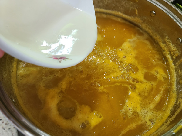 3. 찹쌀물을 미리 만들어 두고 호박죽을 약불로 켠 뒤 조금씩 넣어서 저어 줍니다. 이때 호박죽이 마구마구 튈 수 있으니 조심하시길요. 불 너무 세게하면 안됨!