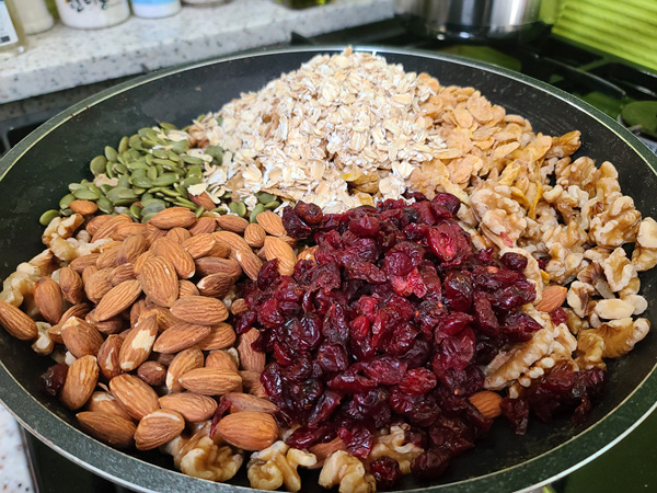 필요한 재료 - 각종 견과류 ( 아몬드, 캐슈넛, 호두, 호박씨, 해바라기씨, 건포도, 건크랜베리, 건포도 등) , 시리얼 그리고 설탕, 꿀, 물