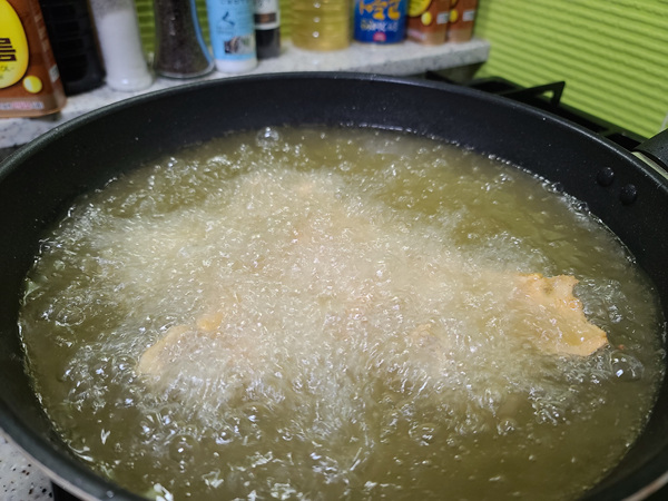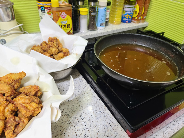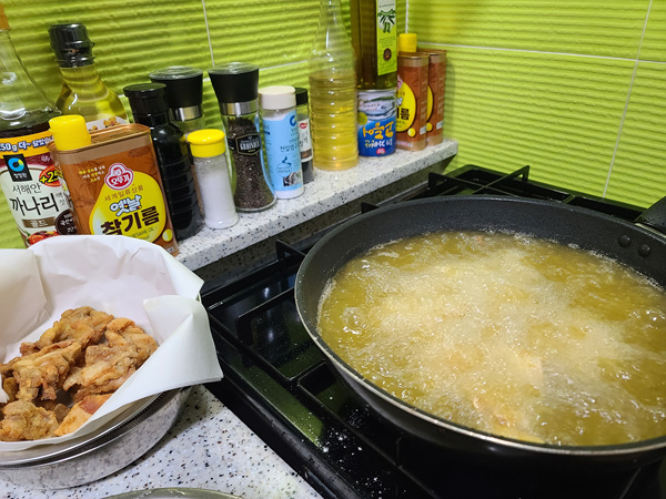 '기름은 또 왜 이렇게 많이 들어가는거야? ' 혼자서 궁시렁 거리긴 했지만 거실에서 지켜 보는 남편의 눈빛이 맛있을거란 느낌이 팍팍 들어 조용히 닭튀김을 준비했지요.