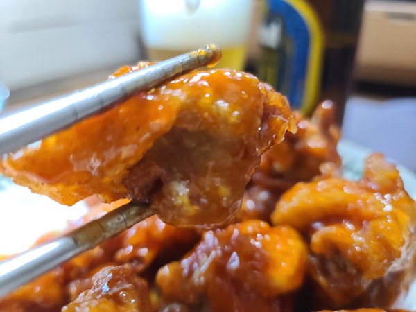 닭은 두 번 튀겼더니 역시나 바삭하니 정말 맛있어요. 그냥 먹어도 맛있지만 우리가 원하는건 양념통닭이기에 마트에서 사 온 양념통닭 소스를 부어서 섞었어요.