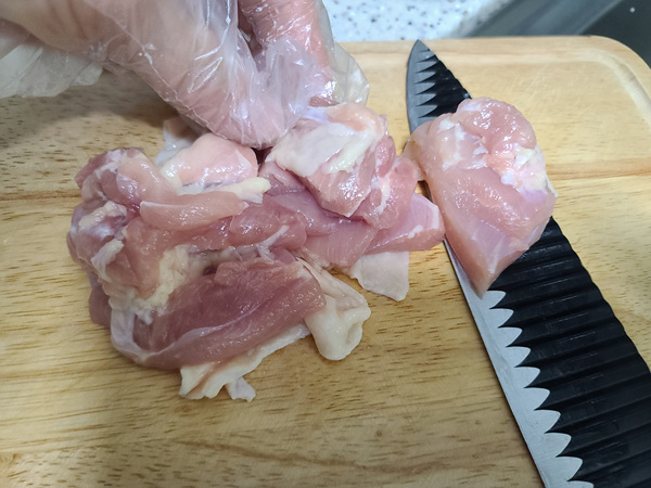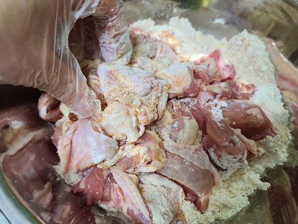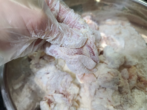 닭은 먹기 좋게 한 번 더 손질하고 튀김가루를 묻혀 튀기기로 했습니다. 잘게 자르다 보니 어찌나 양이 많은지...... ㅜㅜ