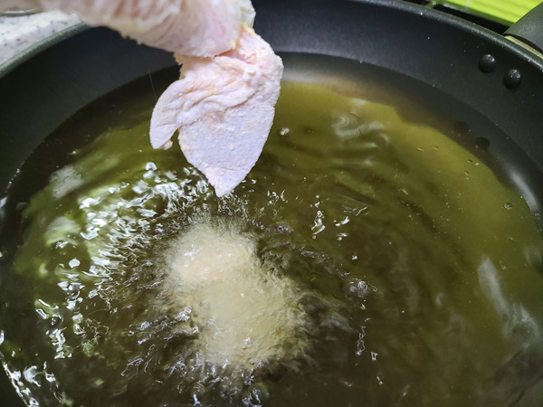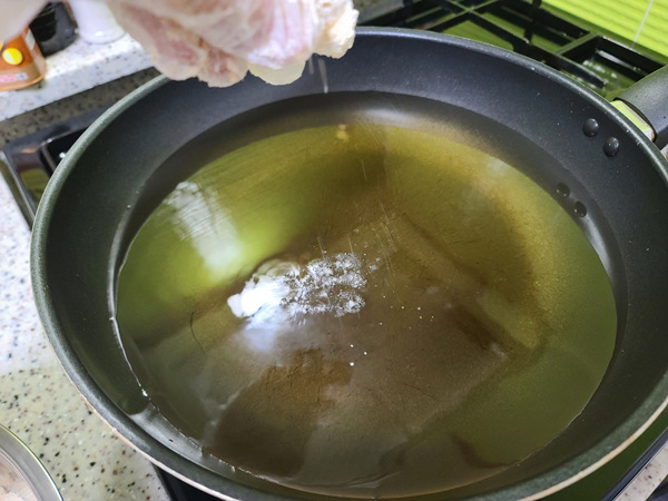 이제 닭 튀김 준비 완료~ 기름을 달구고 온도를 측정했습니다. 온도는 튀김가루를 넣었을때 바로 뜨면 온도기를 재지 않아도 170도 정도 됩니다. 예전에 집에서 돈까스 많이 해 먹은 나만의 기름 온도 체크 요령.......