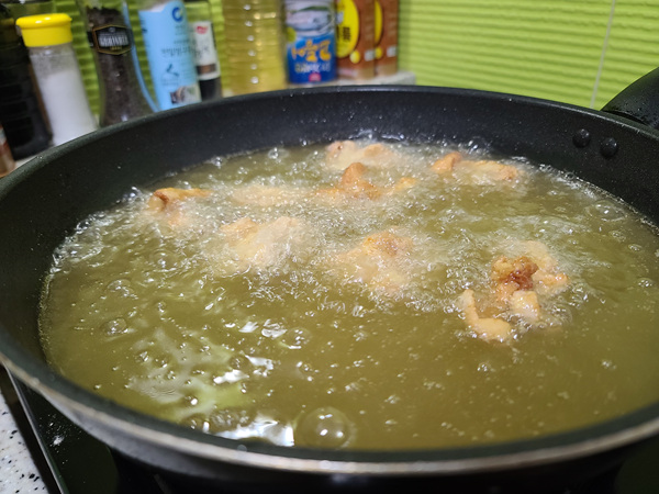 한 번만 튀겨도 나름 다 익어 보이지만.....바삭하게 먹기 위해 기름이 제거되면 한 번 더 튀겨 냅니다.
