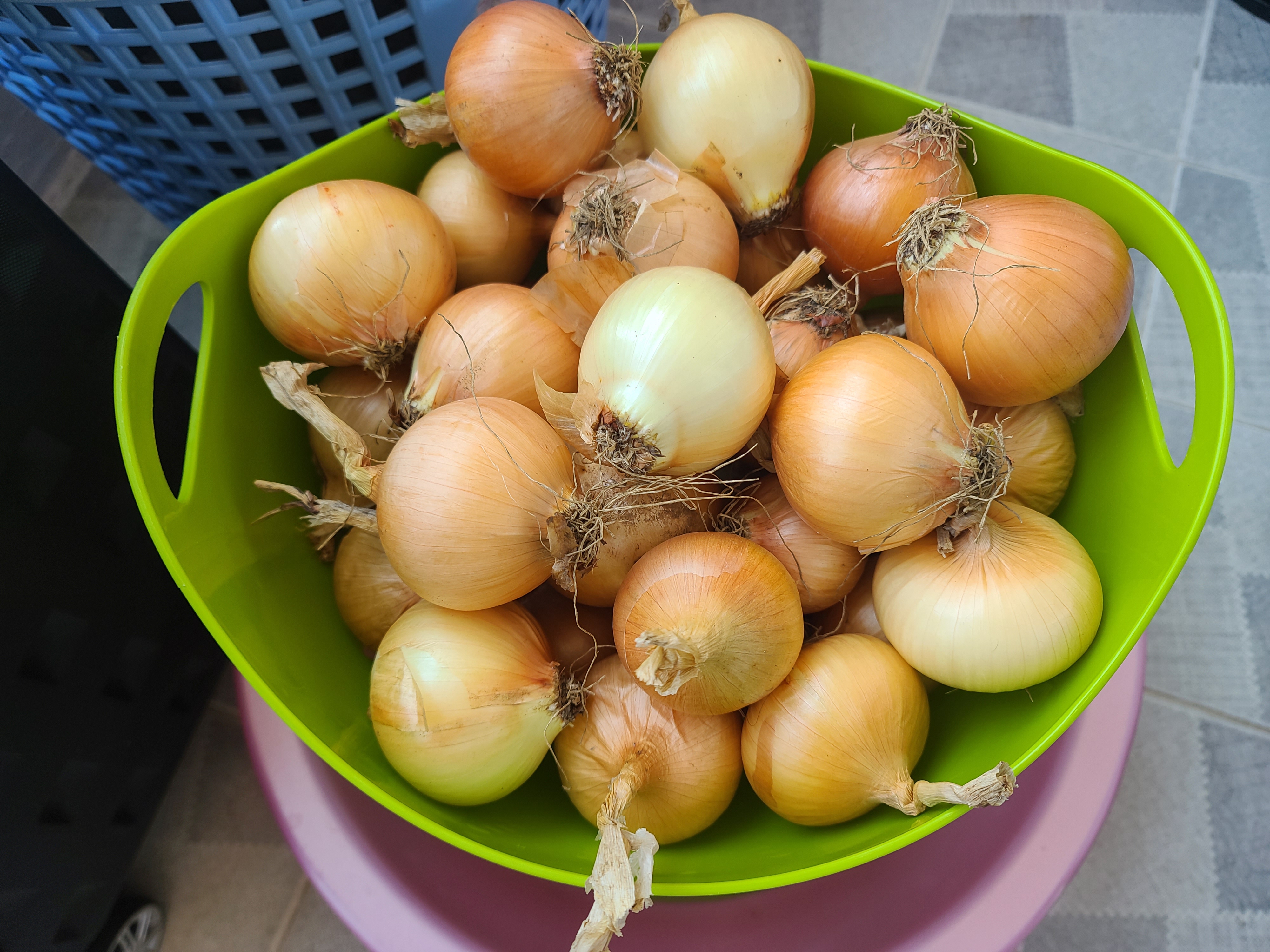 어제 저렴하다고 구입했던 양파인데 바짝 말려 사용하려고 바구니에 담아 뒀는데 여기에 든 양파를 빨래망에 넣어 보관하기로 했다.