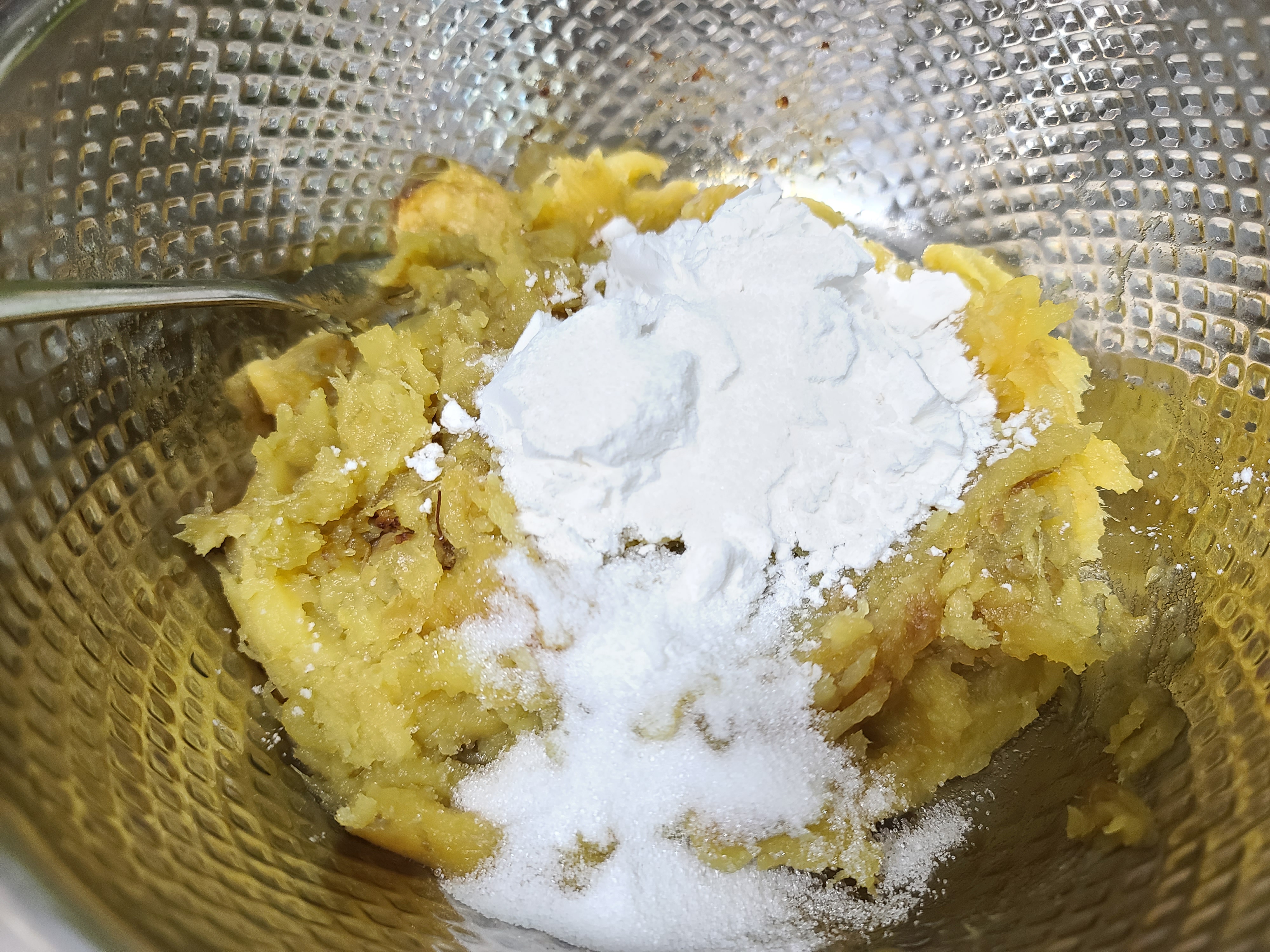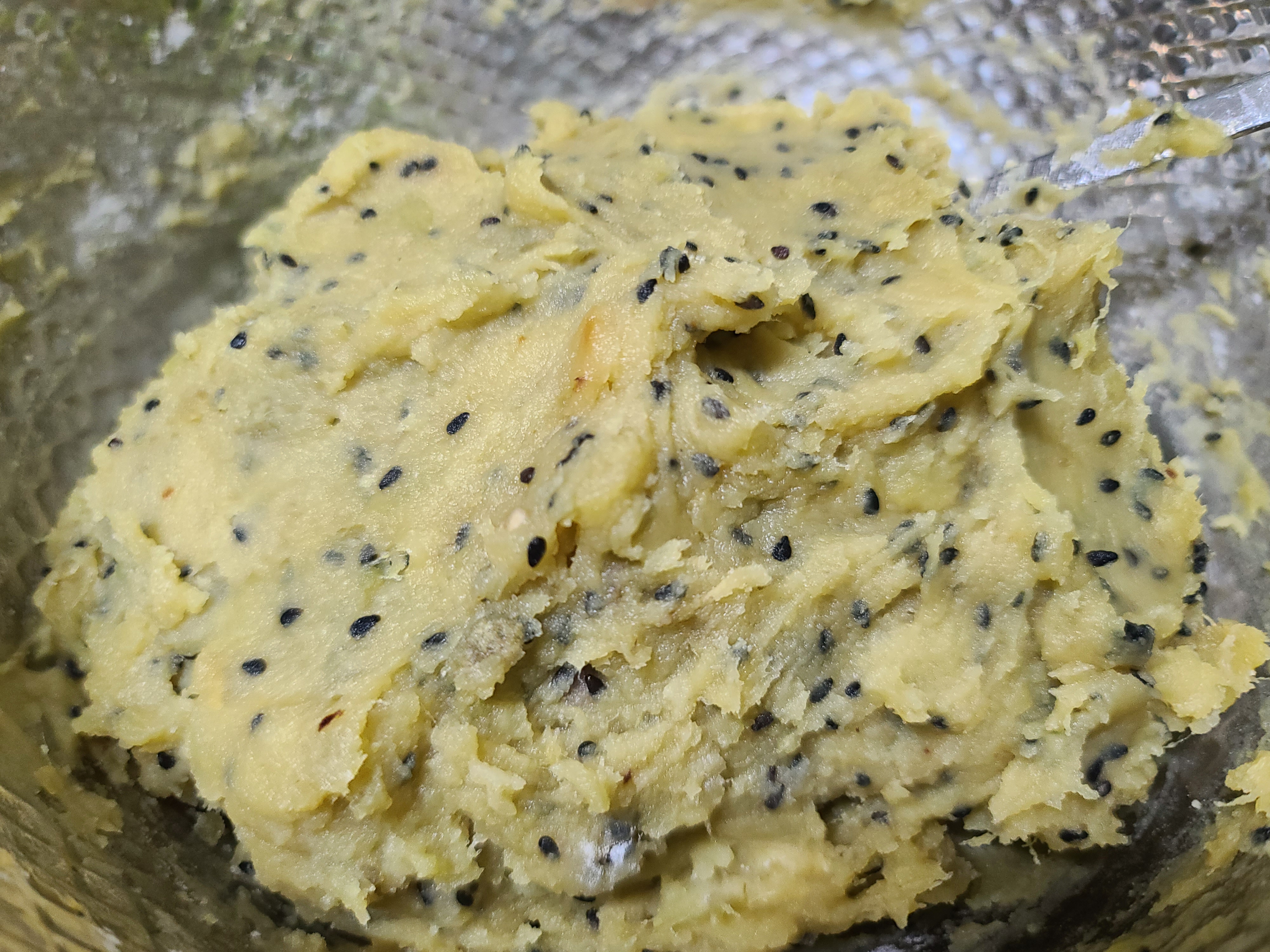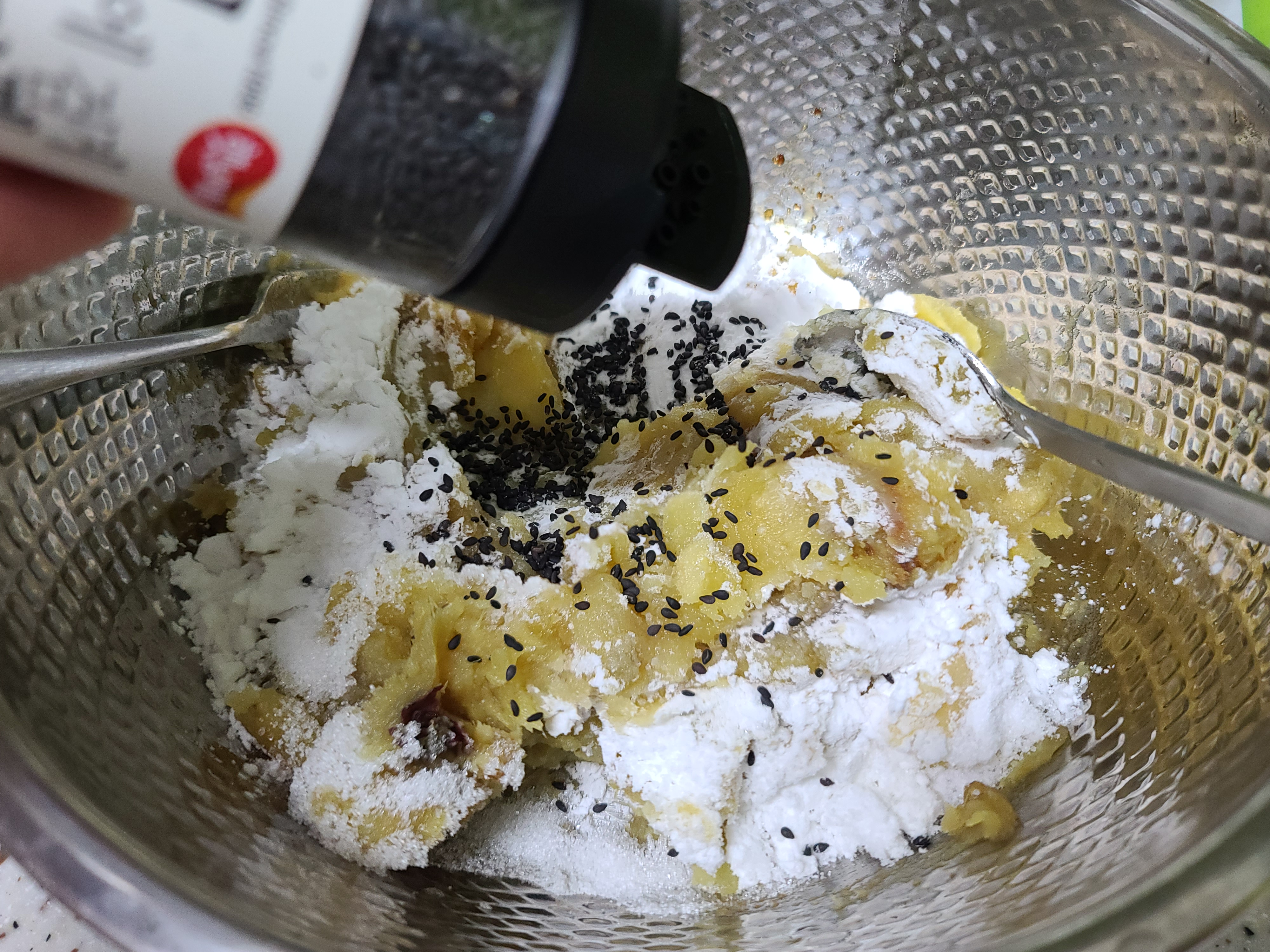 이렇게 으깬 고구마에 전분가루, 찹쌀가루, 통깨, 우유를 섞어 조금 되게 반죽을 한다. 만약 고구마가 달지 않다면 설탕(or 스테비아)을 적정량 섞는다.