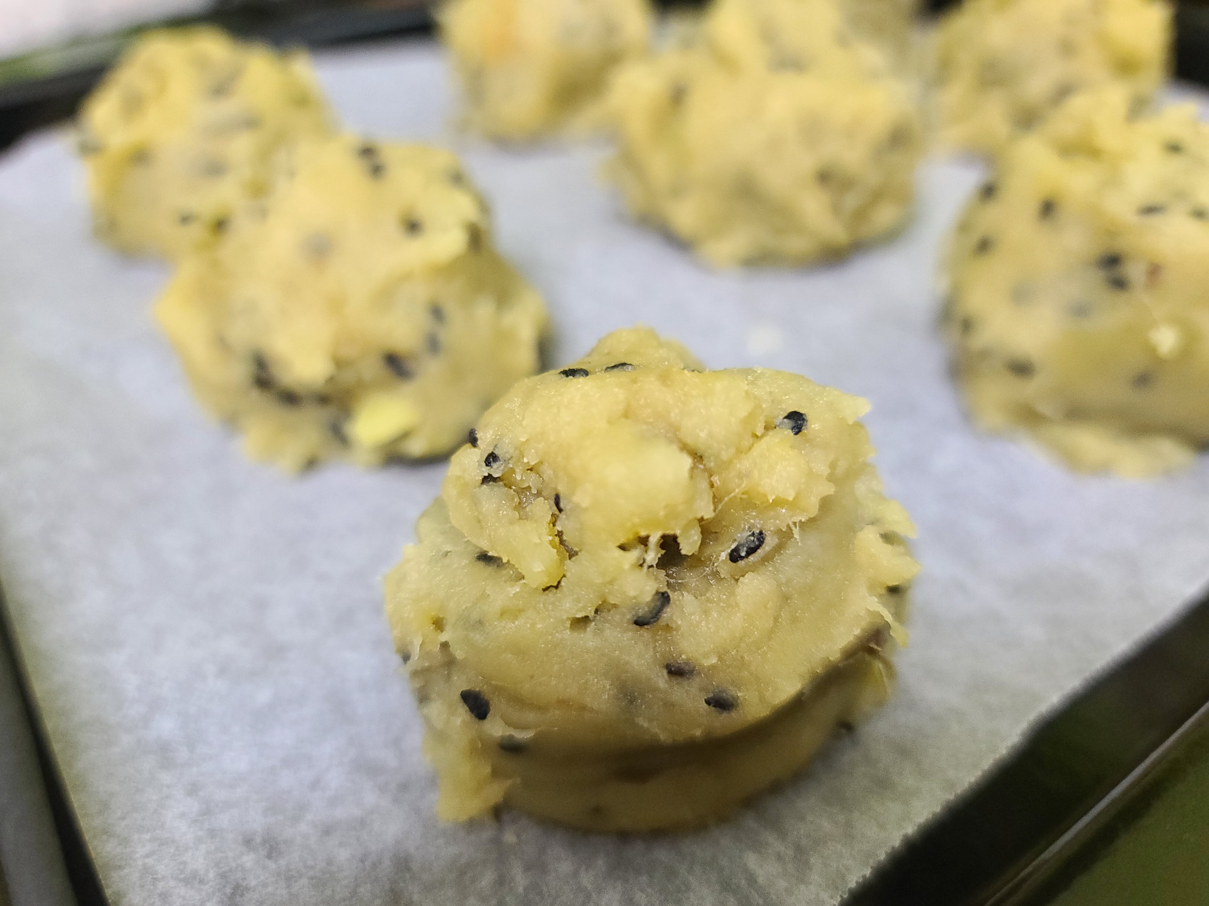 이렇게 반죽한 것을 오븐에 굽는다. 구울때는 종이호일을 깔고 한 숟가락 정도의 양을 동글동글 올려 준다.