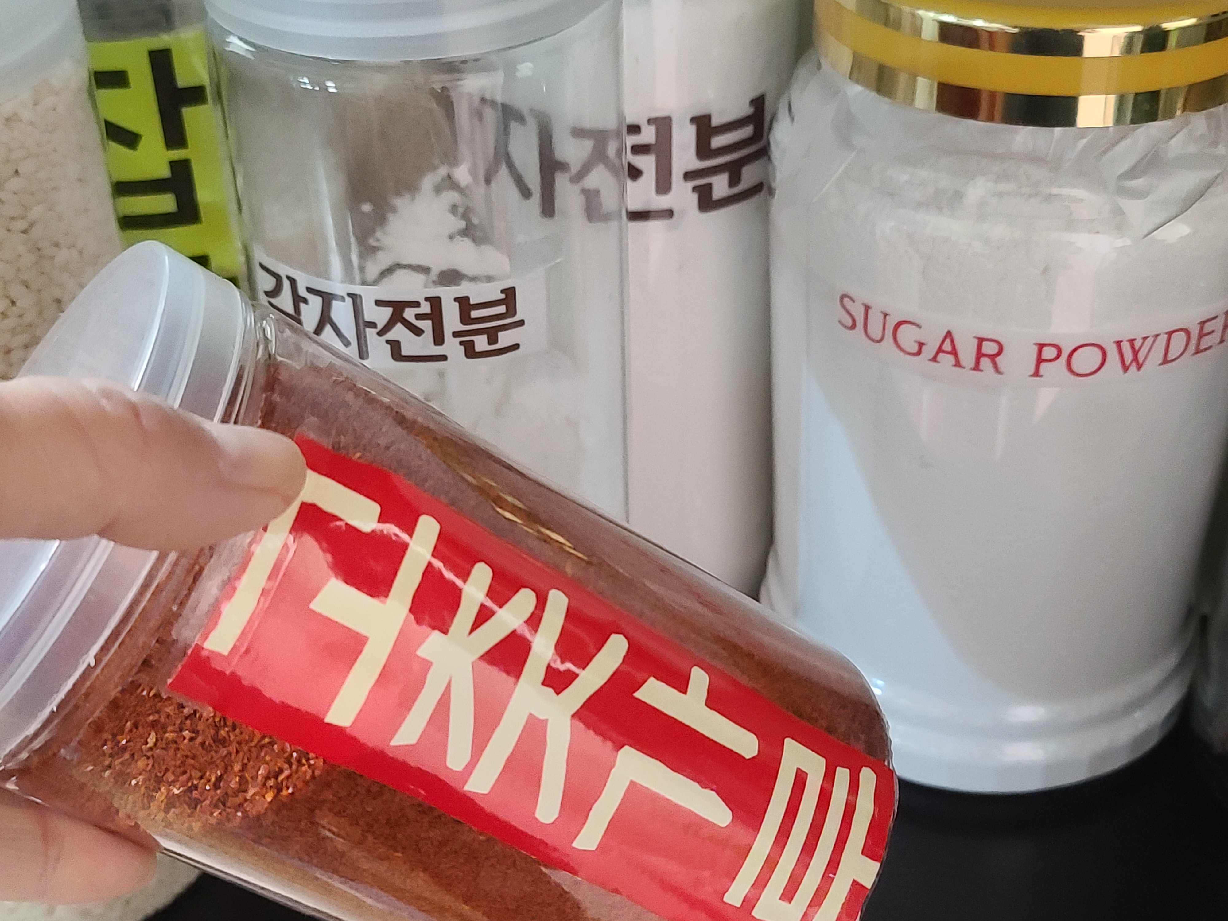 그리고 통에 담아 놓은 식재료에 잘라 놓은 상표를 스카치테이프를 이용해 붙여두니 훨씬 눈에 잘 띄고 나름대로 찾기가 더 쉬워졌다.