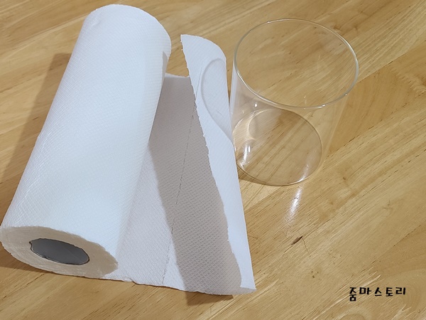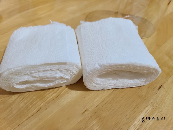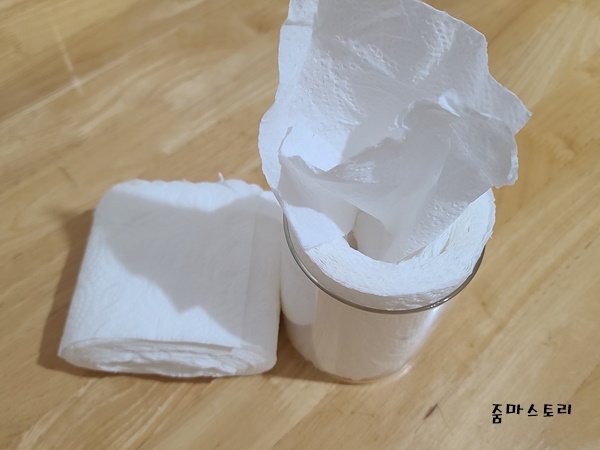 바로 이렇게 되면 이제 사용하기만 하면 되는데요. 왜 이렇게 키친타월을 반으로 잘라 사용할 생각을 했을까? 이유는 간단해요. 보통 키친타월을 사용할때는 닦을 것이 많거나 적거나 늘 줄줄 끊어서 사용했었어요. 그런데 은근히 낭비가 심하더라고요. 그래서 반으로 잘라 사용해 봤거든요. 어찌나 유용하고 딱 필요한 곳에 알맞게 사용할 수 있어 정말 괜찮더라고요.