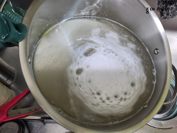 뜨거운 물을 만나면 이렇듯 거품이 마구마구 나면서 찌든때가 지워지는데요. 거품이 완전이 없어질때까지 기다리기만 하면 되세요. 뜨거울때 씻어야지! 하는 생각은 하지 마시길...... 호흡기도 안 좋을 수 있고 무엇보다고 화상의 위험이 있으니까요.