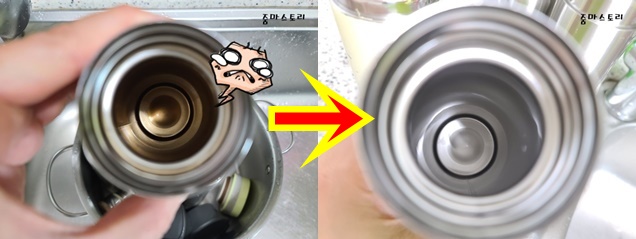 주방세제로 세척하기 전 텀블러 내부 잠깐 볼까요. 어떤가요. 누렇게 커피로 변색된 내부가 깔끔하게 변했어요. 매일은 아니어도 한 달에 한 번은 이 방법으로 텀블러 세척해 주면 위생적이고 깔끔하게 사용 가능하겠죠.