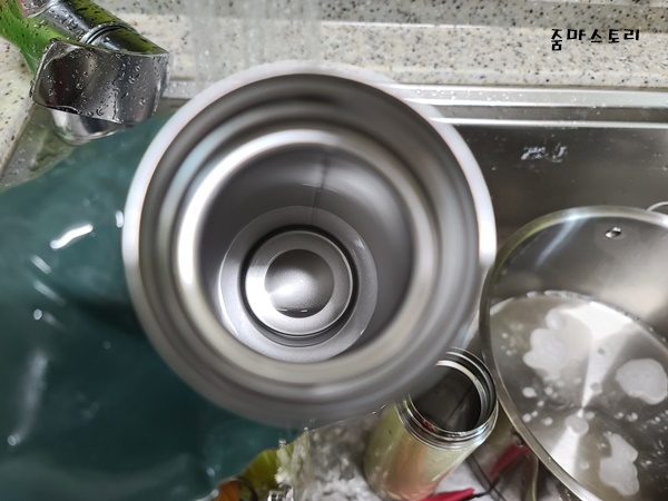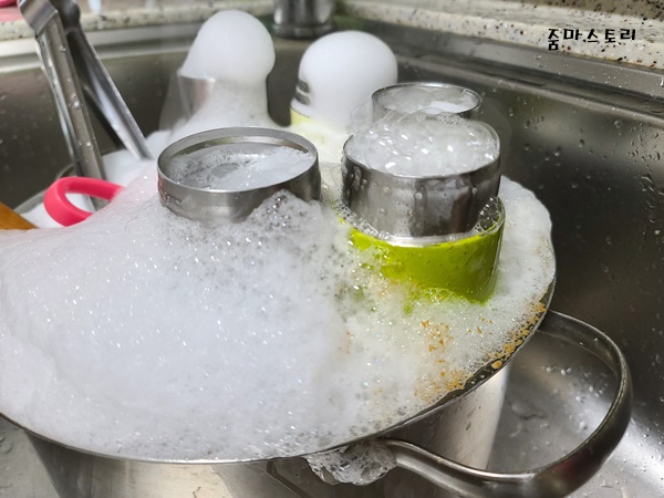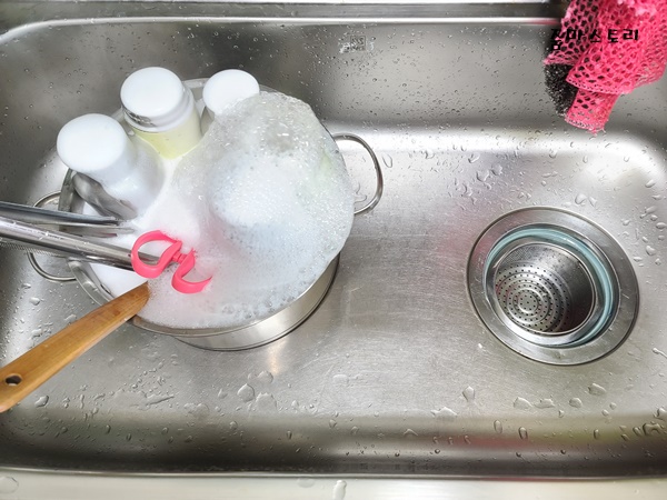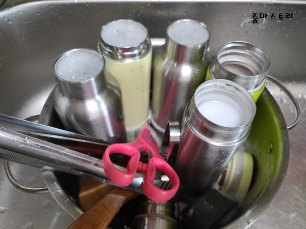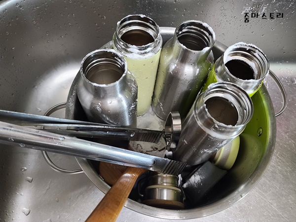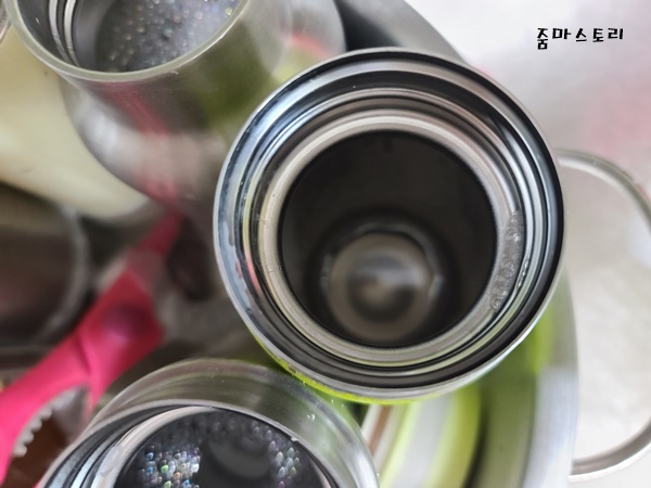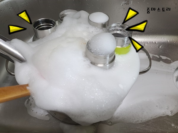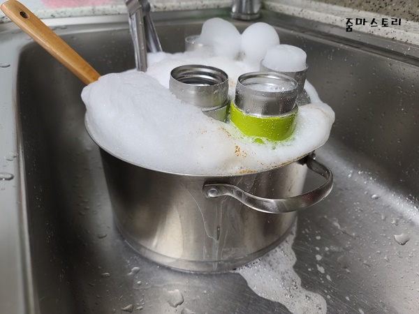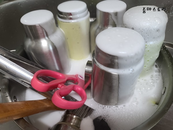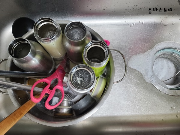 참고로 텀블러를 세척할때는 주변에 설거지는 없애 주세요. 그래야 거품이 넘치면서 싱크대 배수구 청소가 자연스럽게 됩니다. 일거양득의 효과라고나 할까요.