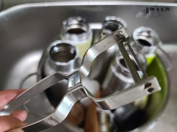전 감자 깎는 필러랑 각종 집게를 넣어서 같이 세척하기로 했답니다. 오래 사용해 군데군데 녹이나 찌든때도 이렇게 세척하면 간단히 해결 가능하거든요.