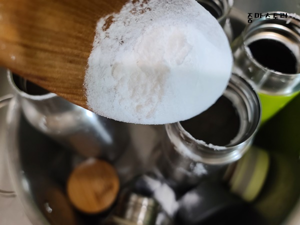 텀블러 세척방법은 씻어야 할 텀블러에 과탄산소다를 솔솔 뿌려 줍니다. 내부 변색이 심하다면 조금 넉넉하게 넣어주면 됩니다. 전 나무주걱 한 숟가락으로 텀블러 5개를 세척했습니다.