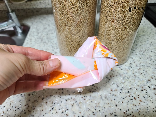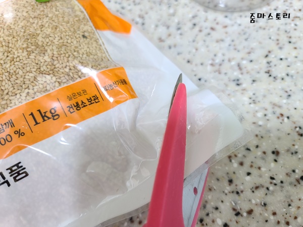 자른 통깨 비닐은 잘 오므려서 넣을 통에 담아주면 쉽게 해결됩니다. 물론 단 하나의 통깨도 바닥에 흐르지 않고 말이죠.