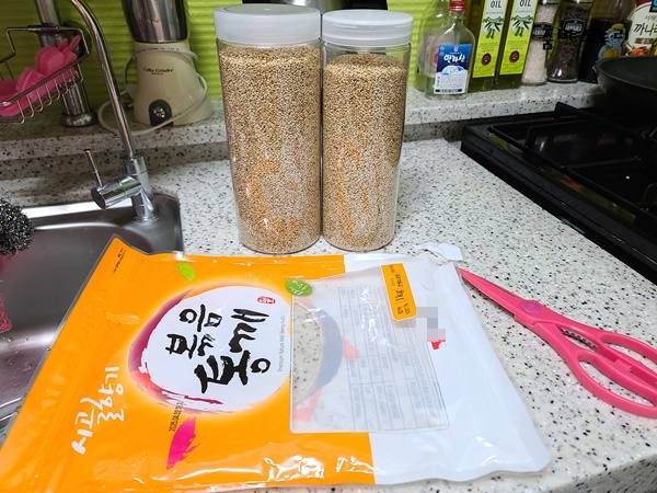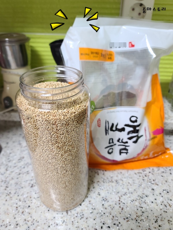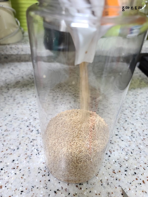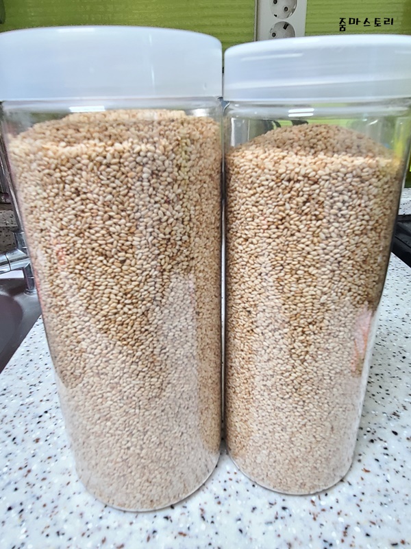 양이 제법 많다 보니 통 하나 더 담아도 되겠더라고요. 그래서 남은 통깨도 통에 담았습니다.