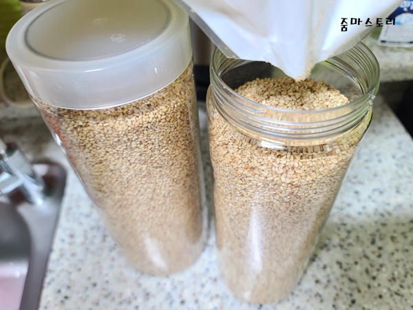 양이 제법 많다 보니 통 하나 더 담아도 되겠더라고요. 그래서 남은 통깨도 통에 담았습니다.