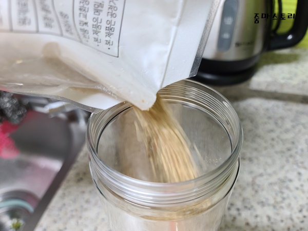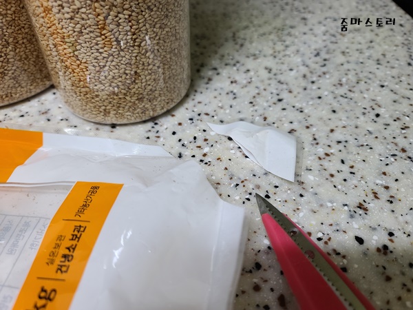 자른 통깨 비닐은 잘 오므려서 넣을 통에 담아주면 쉽게 해결됩니다. 물론 단 하나의 통깨도 바닥에 흐르지 않고 말이죠.