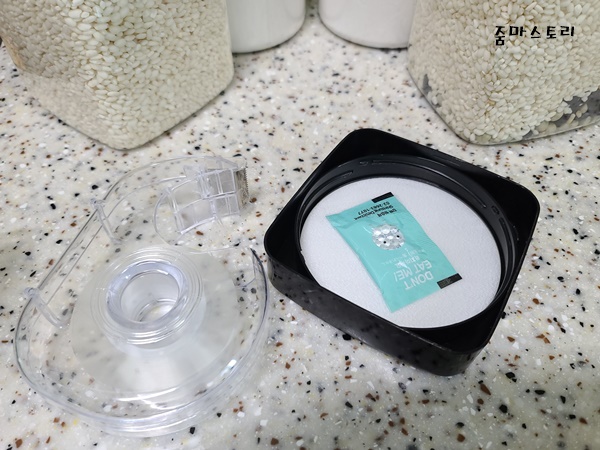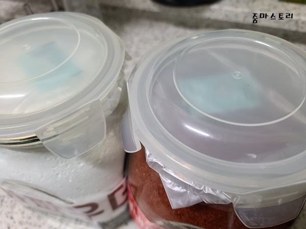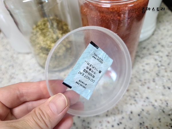 스카치테이프나 양면테이프로 습기제거제를 뚜껑에 고정한 뒤 사용하면 됩니다. 엉첨 간단하죠. 이 간단한 방법으로 인해 요리가 편하고 즐겁고 무엇보다도 위생적이고 좋더라고요. 물론 습기도 없애주고요.