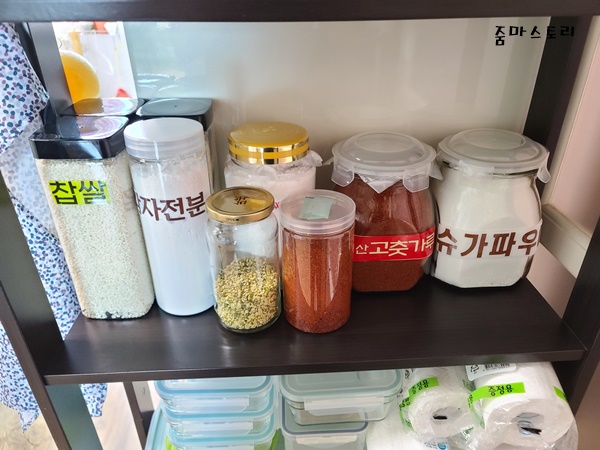 습기가 머금을 만한 식재료나 양념 가루류를 넣은 통의 뚜껑에 습기제거제만 붙여 두면 습한 장마철 문제없이 식재료를 보관할 수있답니다.