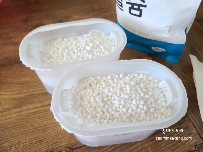물이 가득 찼던 제습제는 깨끗이 씻어 빈통에 다시 염화칼슘을 채워 넣어 통 또한 재활용 했다.