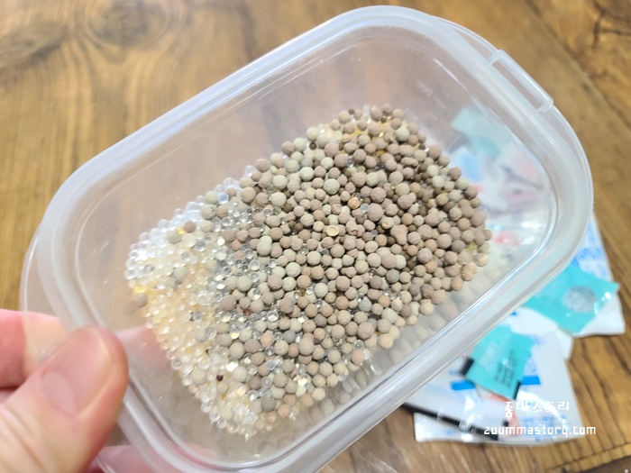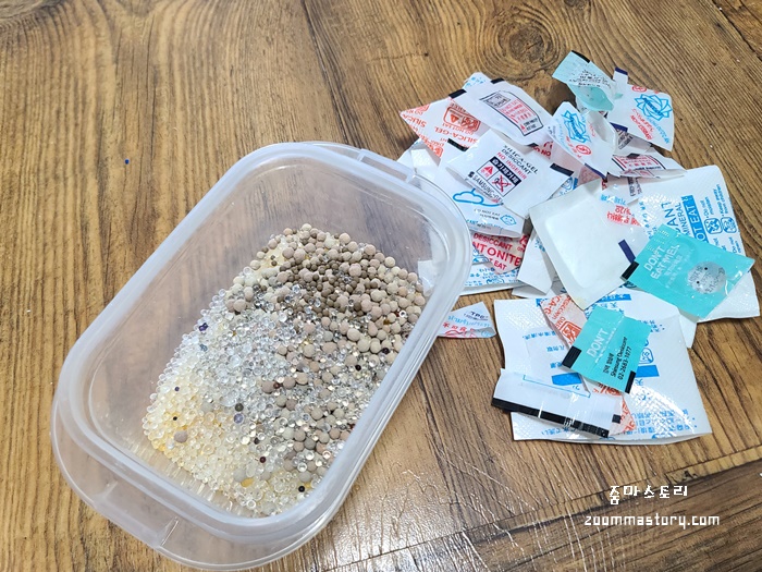 생각보다 많은 실리카겔 (습기제거제)는 통에 다 부어서 전자렌지에 돌리면 한 번은 더 재활용이 가능하다.