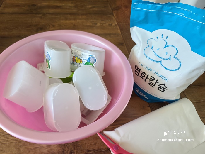 물이 가득 찼던 제습제는 깨끗이 씻어 빈통에 다시 염화칼슘을 채워 넣어 통 또한 재활용 했다.
