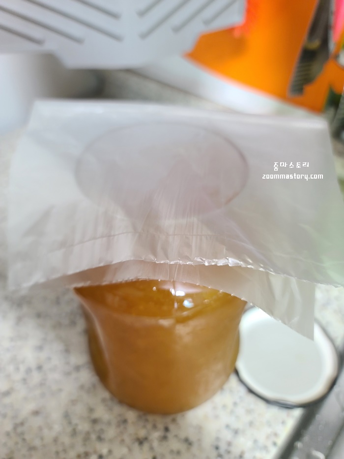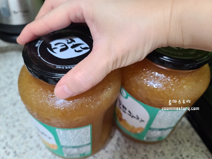 유리병 뚜껑을 열고 차 한 잔 마시기 위해 컵을 내리면서 '아하! ' 이것도 알려주면 되겠다 싶어 사진 2장 찍었다. 그건 바로 먹던 제품을 보관할때 뚜껑을 쉽게 여는 방법이다.