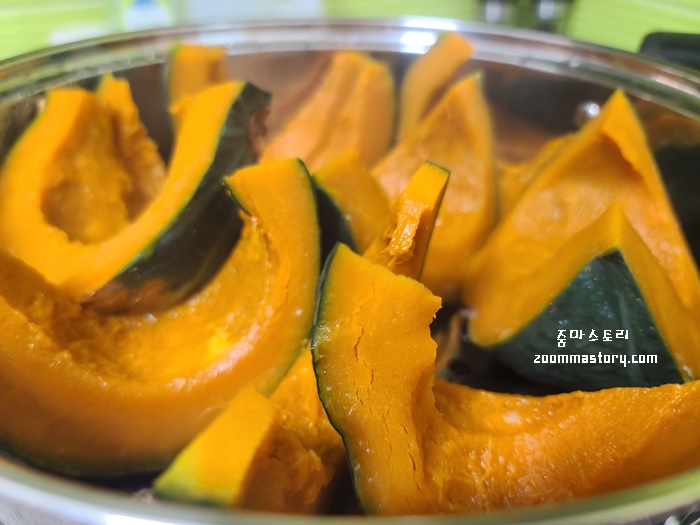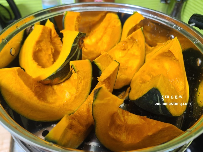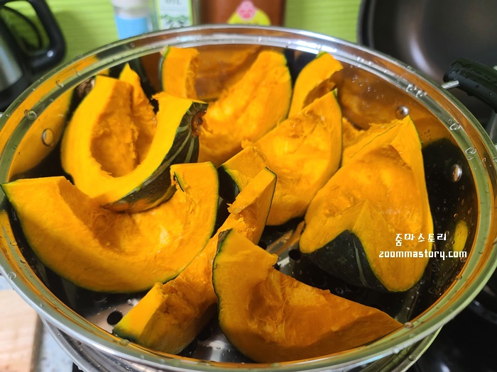 단호박을 찜기에 넣고 약10분 간 쪄 낸다. 가스불은 중불에서 시작해 물이 끓어 오르면 약불에서 단호박 색이 변하는 것을 주목하고 원하는 삶기를 택해 불을 끄면 된다.