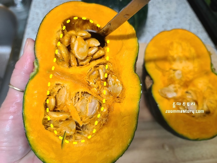 이렇게 자른 단호박은 속을 파내야 하는데 숟가락을 이용하면 간단히 해결된다. 숟가락으로 쿡 질러서 씨 있는 부분을 도려 내듯 긁어 내면 된다.