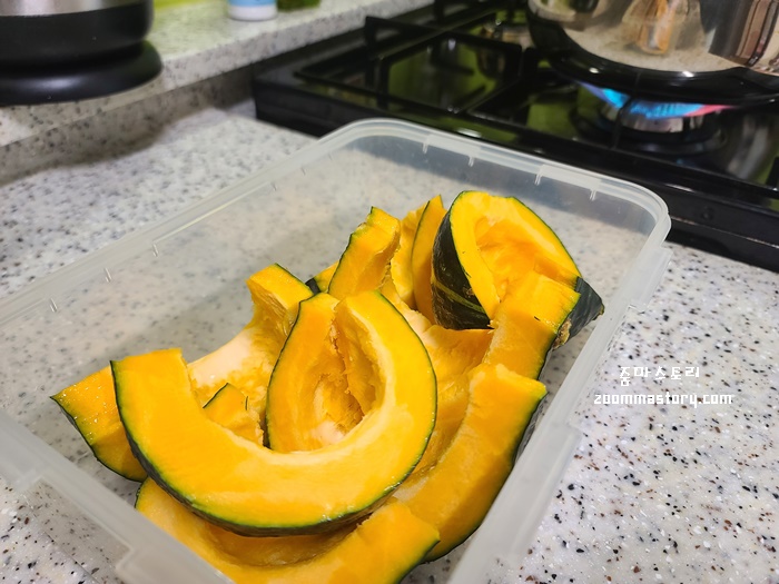 먹기 좋은 크기로 썬 단호박은 쪄서 그냥 먹어도 맛있고 각종 요리에 넣어서 먹어도 맛있다.