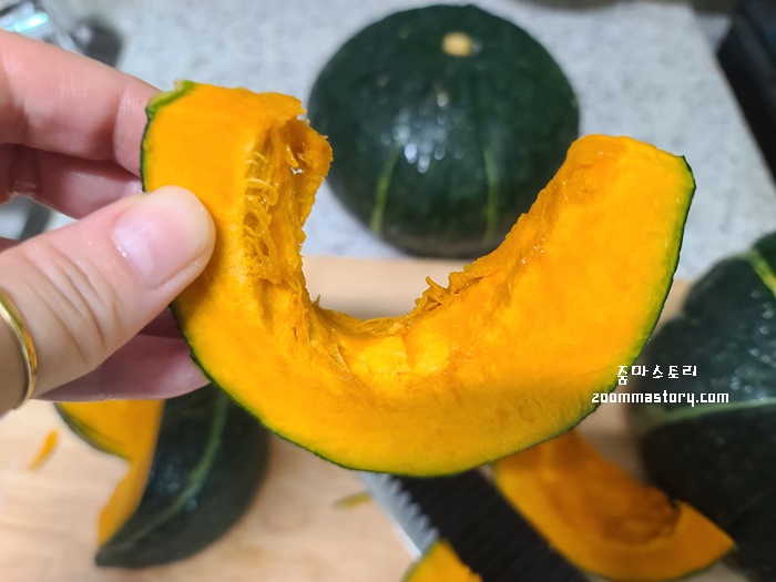 속도 파내고 잘 손질된 단호박은 먹기 좋은 크기로 자르는데 이때도 단호박 중심을 시작으로 칼로 썬다.