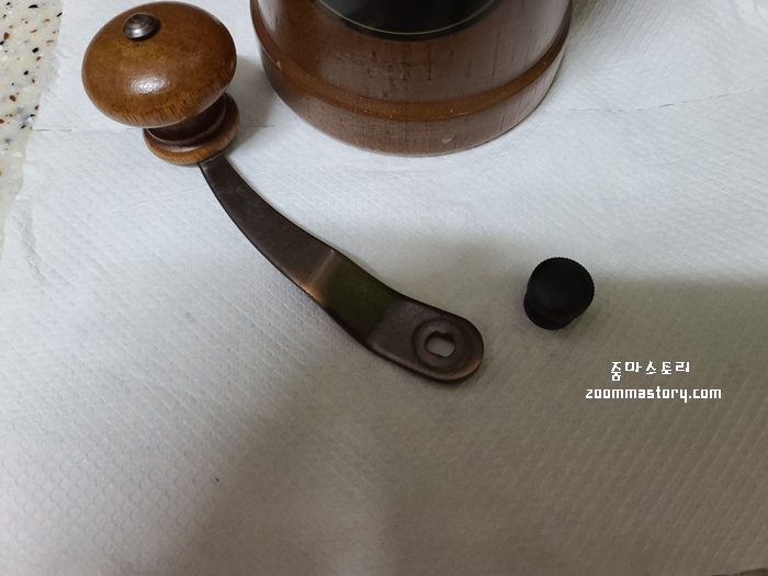 핸드밀 윗부분의 손잡이를 먼저 분리합니다. 손으로 쉽게 가능하니 천천히 해 보세요.