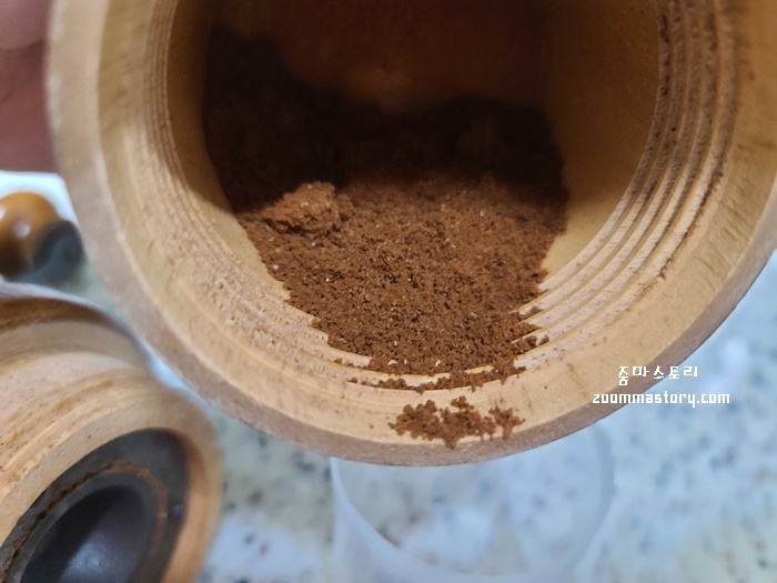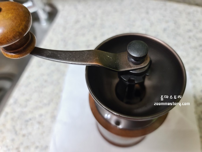 분쇄도를 거칠게 하면 원두 분쇄를 할 경우 힘이 별로 안 들어 갑니다. 단, 분쇄도를 곱게 설정할 경우엔 힘이 엄청 많이 들어 갑니다. 그러니 처음 핸드밀로 분쇄도를 설정할 경우엔 원두 상태에 따라 여러 번 해 보는 것이 제일 중요합니다.