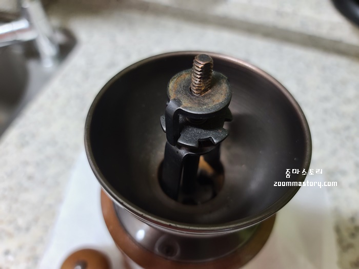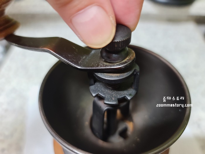 그럼 이제 고정핀도 분리한 다음에 분쇄도를 조절하면 되는데요. 이렇게 중심축을 잡은 상태에서 분쇄도 조절 나사만 돌리면 됩니다.