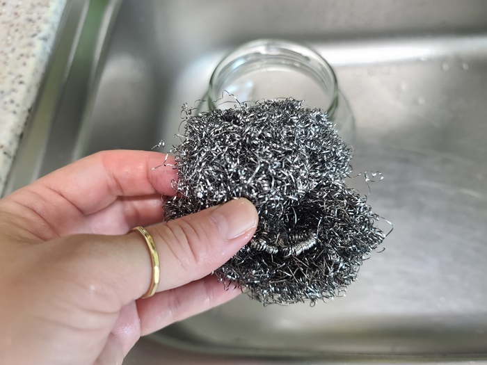 보통 스티커를 손으로도 제거되기 쉽긴 하지만 문제는 스티커를 제거하고 난 뒤 끈적끈적함 때문에 유리병을 그냥 버리는 경우가 있다고 한다. 난 이런 것도 다 깔끔하게 제거하기 위해 수세미를 준비했다. 수세미는 일반적으로 설거지 할때 사용하는 것이 아닌 철수세미다.