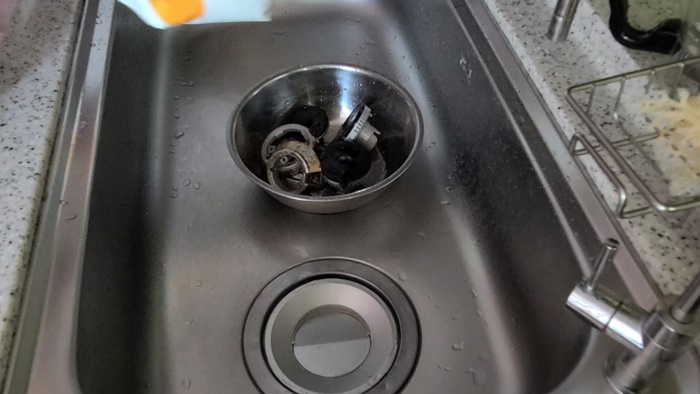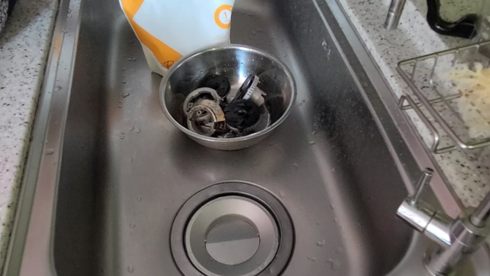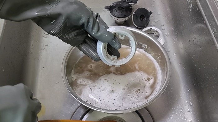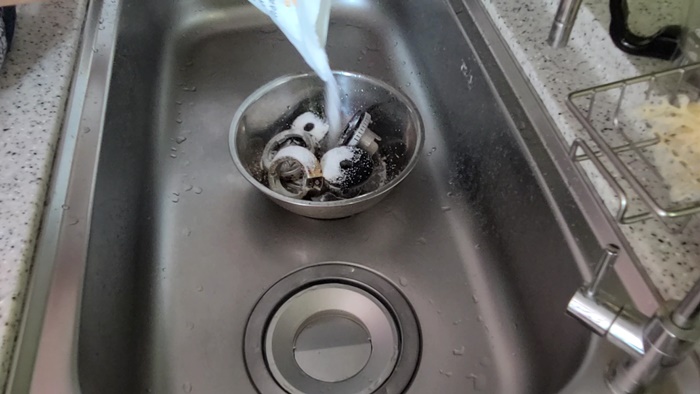 부속은 과탄산소다를 이용해 불려 둔다. 이때 뜨거운 물로 불려야 때가 잘 지워진다. 집 안 청소를 잘하는 분들은 아시겠지만 과탄산소다를 사용할때는 꼭 환기는 필수이고 고무장갑을 착용하도록 한다.