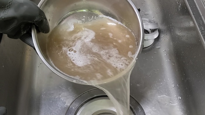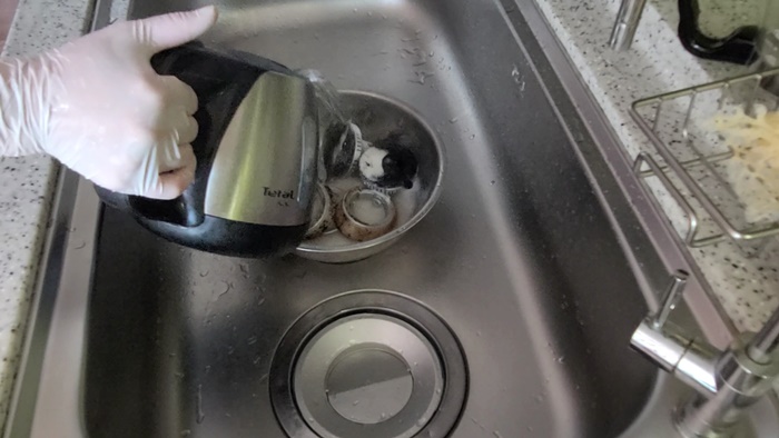 부속을 볼에 담은 뒤 뜨거운 물을 부어주고 약 10분 정도 방치한다. 때가 많을때는 시간을 더 있어도 무방하다.