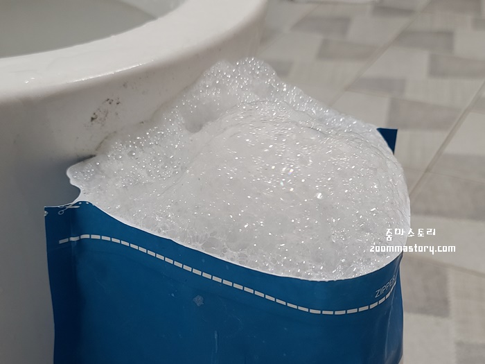 과탄산소다와 뜨거운 물이 만나면 바로 거품이 올라 오기 때문에 조금 큰 비닐봉지가 좋다. 난 집에 있던 재활용 비닐봉지를 사용했는데 조금 작아서 거품이 조금 꺼질때까지 기다렸다.