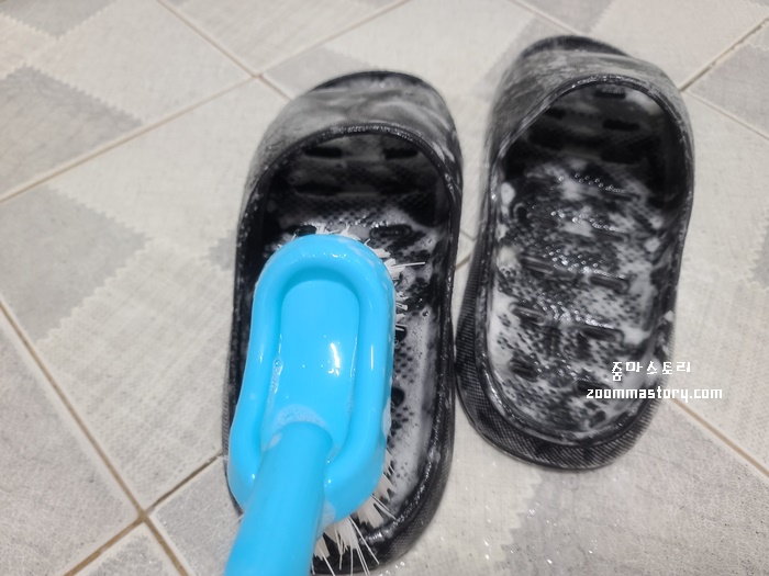 거품이 올라 오니 이내 시꺼먼 때가 주변에 붙었다. 이래서 비닐봉지가 넉넉한 것이 세척하기엔 편하다. 난 욕실화가 딱 맞게 들어가서 조금 빡빡한 느낌이 들었다.