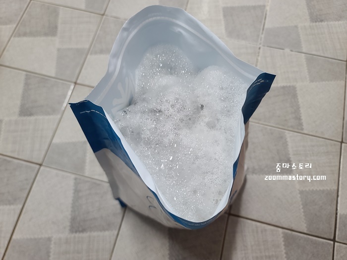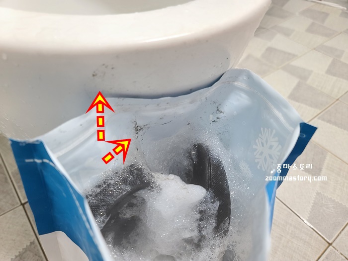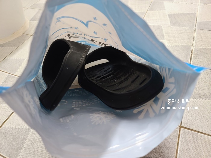 거품이 올라 오니 이내 시꺼먼 때가 주변에 붙었다. 이래서 비닐봉지가 넉넉한 것이 세척하기엔 편하다. 난 욕실화가 딱 맞게 들어가서 조금 빡빡한 느낌이 들었다.